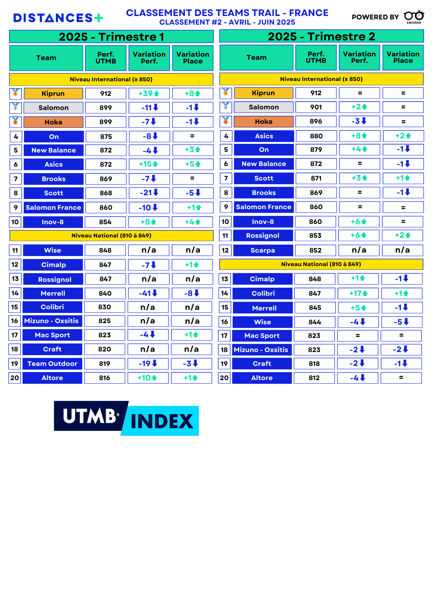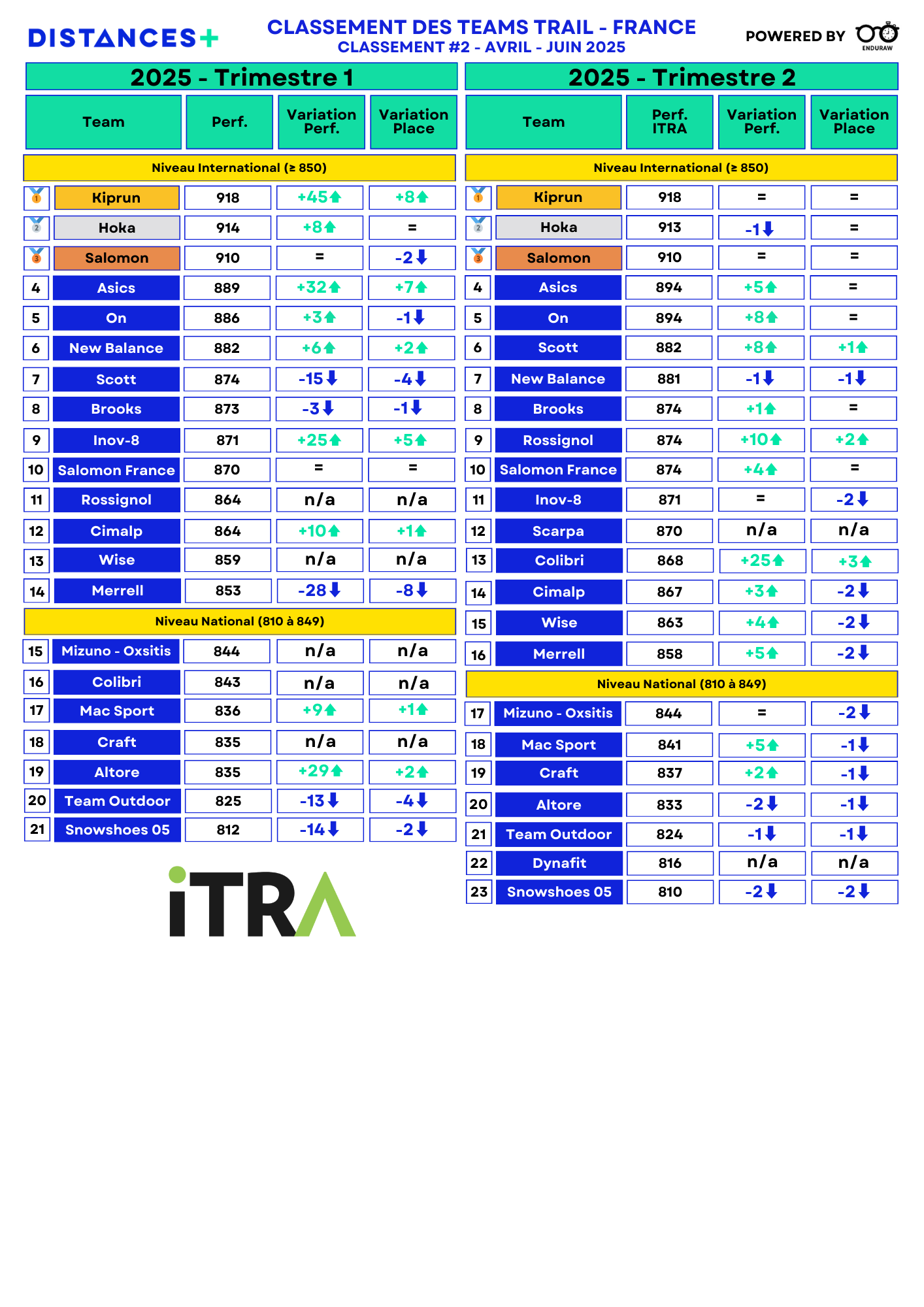 Au deuxième trimestre 2025, Kiprun, Hoka et Salomon dominent toujours le classement français des teams trail élite. Un classement qui n'a pas beaucoup évolué même si de jeunes athlètes tentent de bousculer l'ordre établi. Autres faits marquants de l'actualité, le retour de Mathieu Blanchard au Québec et la 13e édition à venir de l'Échappée Belle.